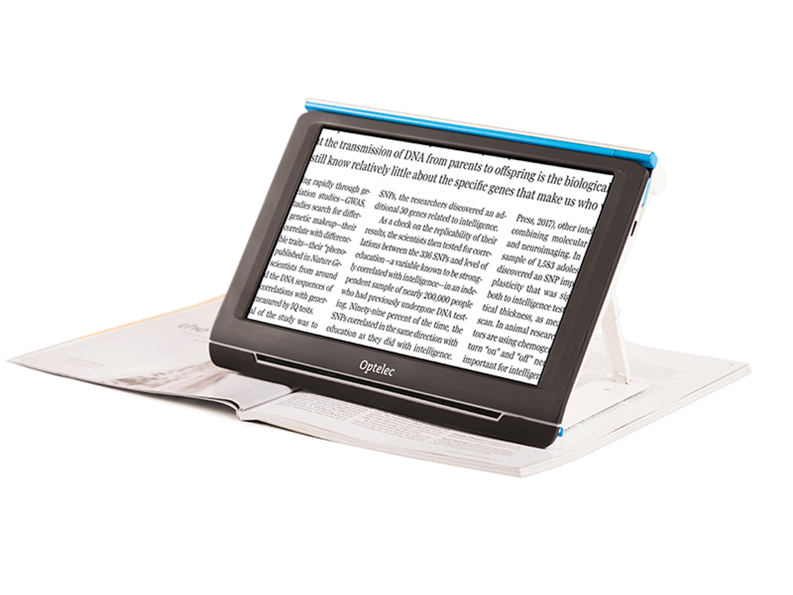 Med den svingbare kameraarm åbner sig flere nye muligheder, så du let kan se på fotos, medicinemballage og endda aflæse på runde emner uden at være begrænset i dine bevægelser. Kameraarmen giver dig også mulighed for at skrive i hånden og i øvrigt forstørre hvad du lægger under kameraet.