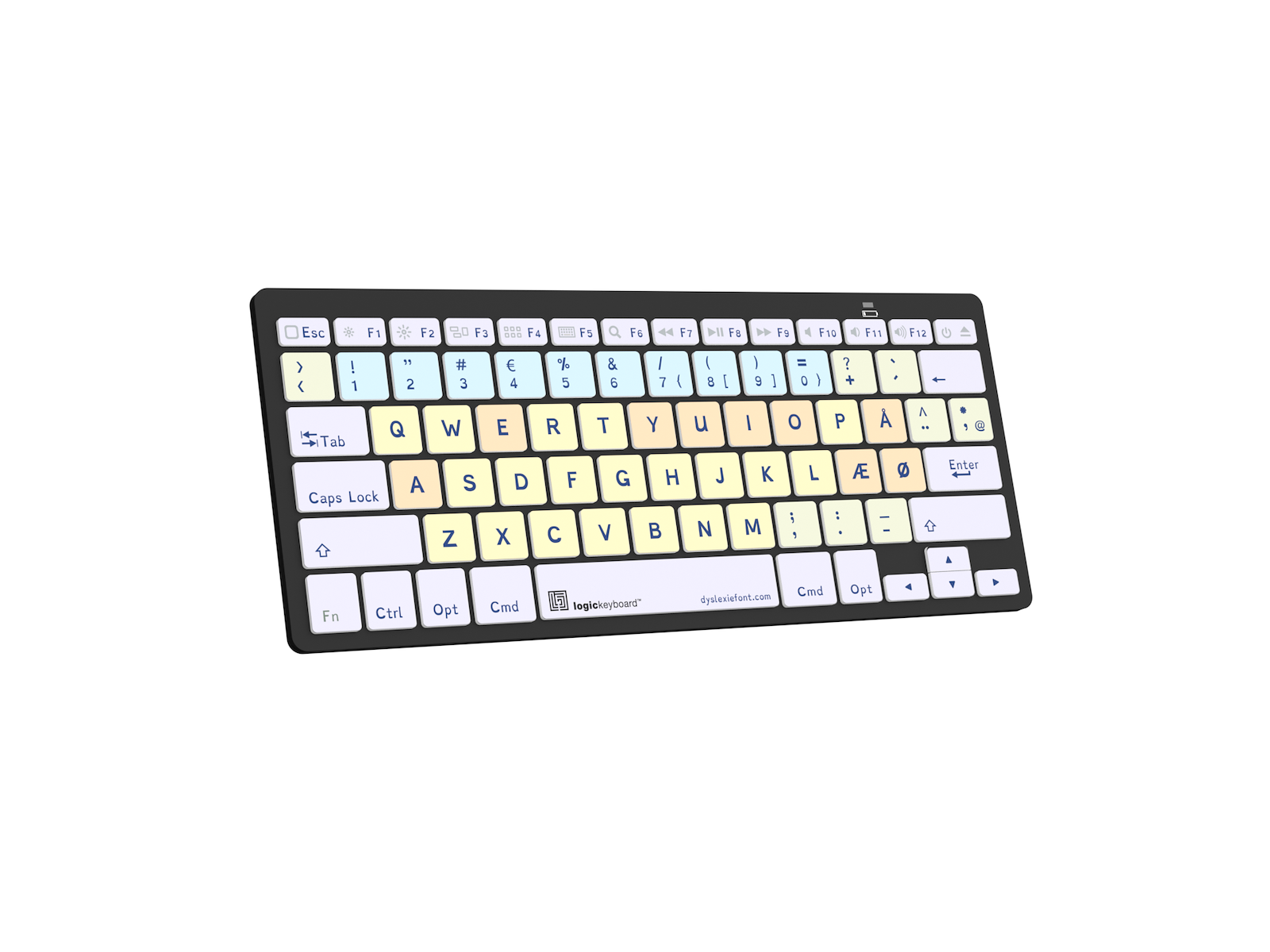 Farvekodet Bluetooth-tastatur med Dyslexie-font – gør det nemmere for ordblinde at skrive på tastatur uden forvekslinger. Kompakt, trådløst og kompatibelt med Apple Mac og iPad. Ideelt til skole og hjemmebrug.